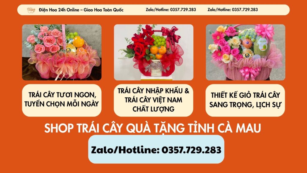 Shop trái cây quà tặng Tỉnh Cà Mau là địa chỉ chuyên cung cấp các mẫu giỏ trái cây cao cấp, phục vụ nhu cầu biếu tặng ngày càng phổ biến tại khu vực cực Nam của Tổ quốc. Với sự hỗ trợ từ Điện Hoa 24h Online – Giao Hoa Toàn Quốc – Hotline: 0357 729 283, khách hàng có thể đặt giỏ trái cây nhanh chóng và nhận hàng tận nơi tại Cà Mau.